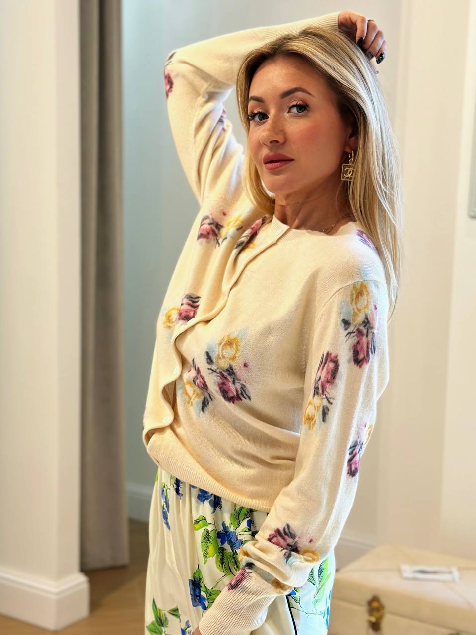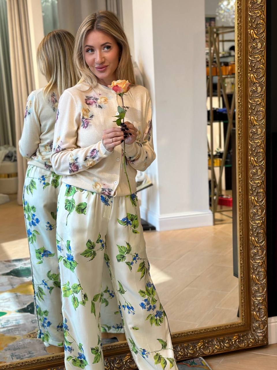 Нежный образ с шерстяным джемпером и шелковыми брюками Шерстяной джемпер — мягкий, уютный, с цветочным принтом и круглым вырезом. Шелковые брюки — струящиеся, свободного кроя, подчеркивают легкость и элегантность. С чем носить: С балетками или лодочками — для романтичного образа. С тонким ремешком на талии — чтобы подчеркнуть силуэт. Аксессуары: Нежные серьги с жемчугом. Миниатюрная сумочка или клатч. Куда: свидание, прогулка в парке, воскресный бранч.