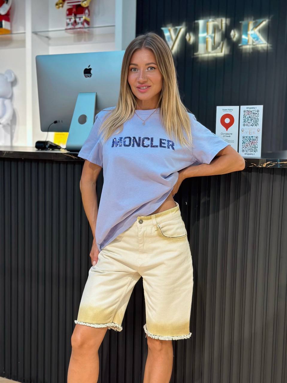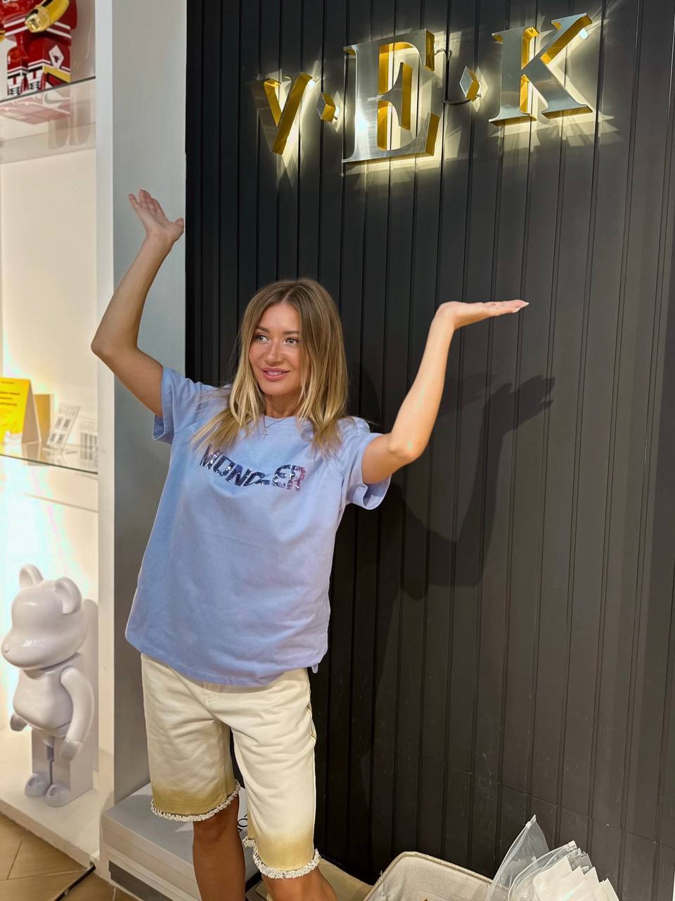 Идеальный дуэт для тех, кто ценит непринуждённую роскошь. Мягкая лавандовая футболка с пайетками создаёт деликатный блеск, а джинсовые бермуды с градиентом добавляют образу лёгкую динамику.