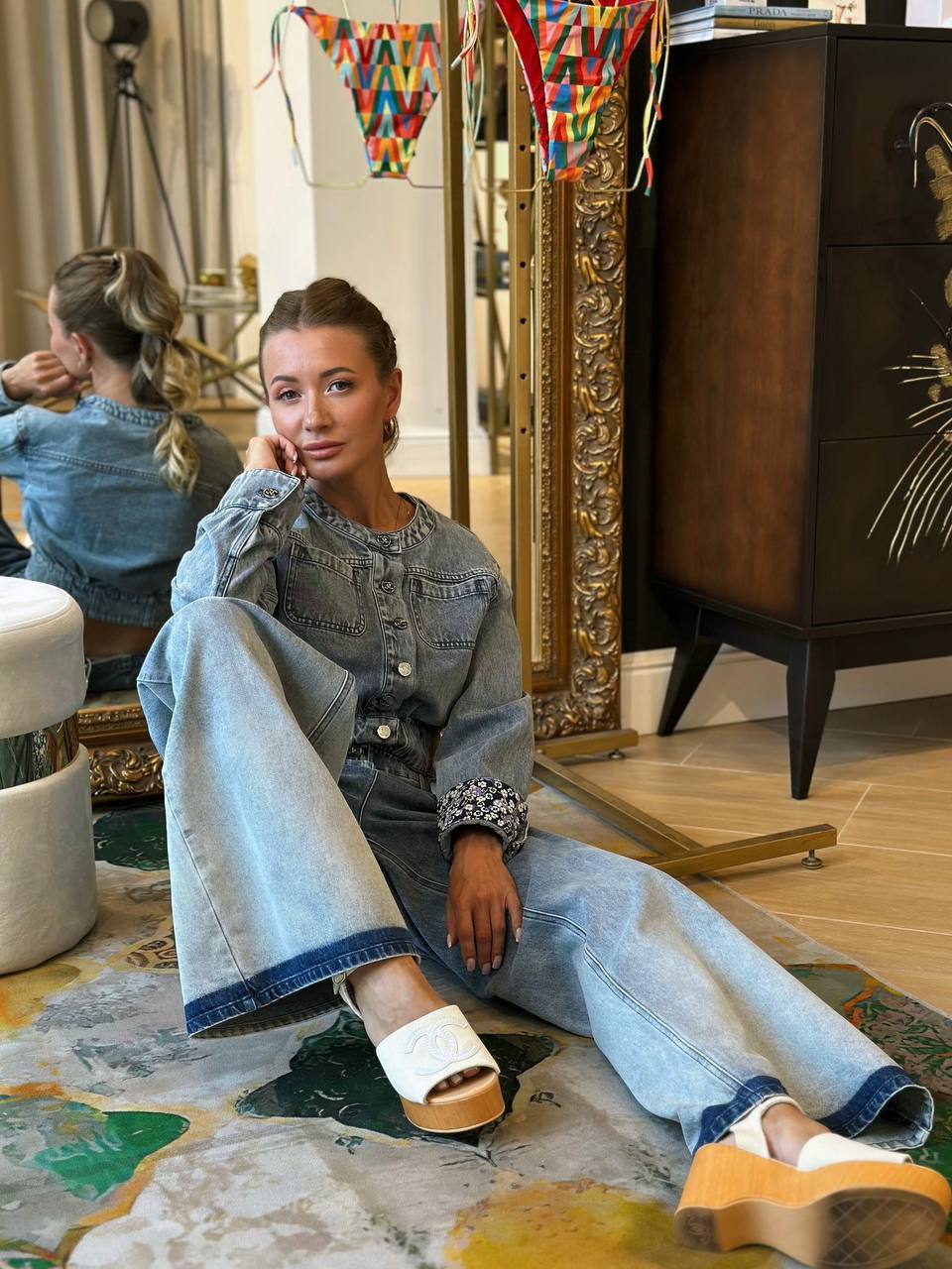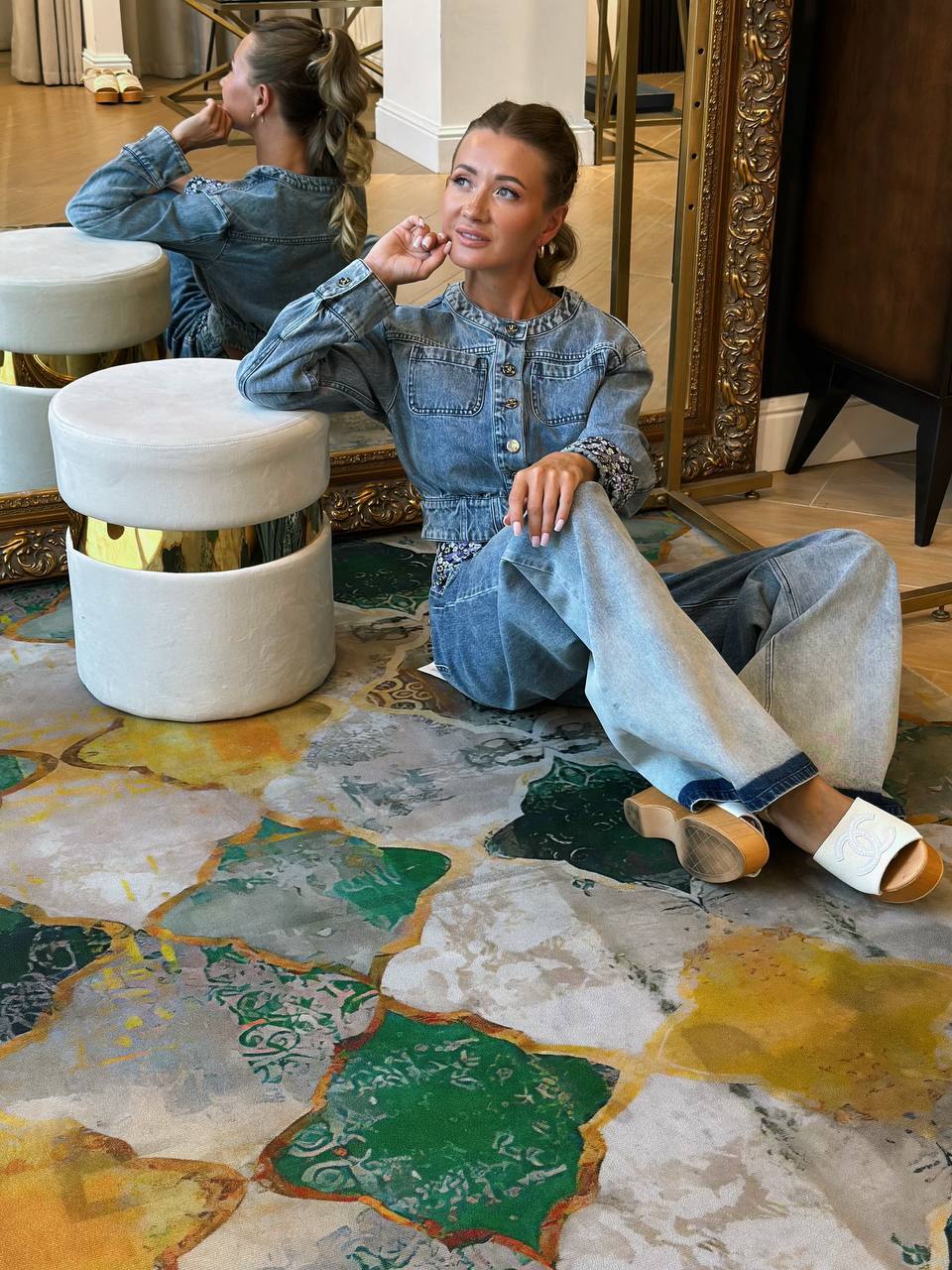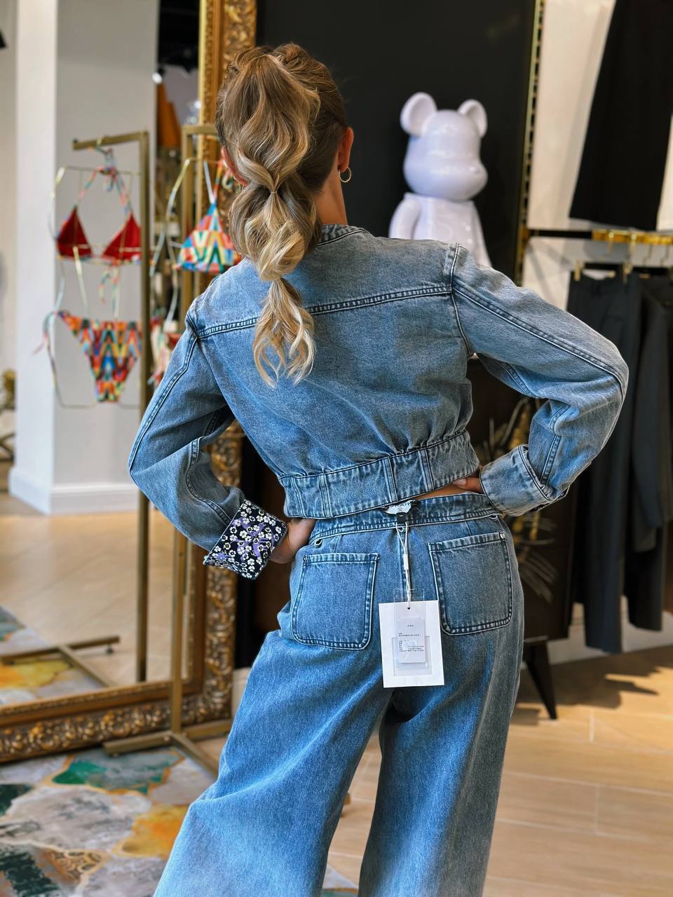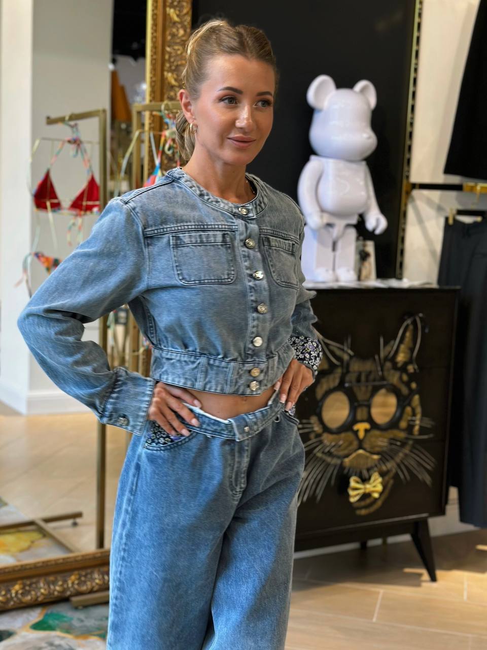 Этот джинсовый комплект — идеальная база для создания модных образов в этом сезоне. Обратите внимание на качество материала: фирменная хлопковая ткань YB с диагональным переплетением обеспечивает и комфорт, и идеальную посадку по фигуре. Куртка с приталенным силуэтом и драпировкой создаст женственный силуэт, а цветочные отвороты на рукавах добавят романтичную ноту. Широкие брюки с градиентом визуально вытянут пропорции, делая образ стройнее и гармоничнее.