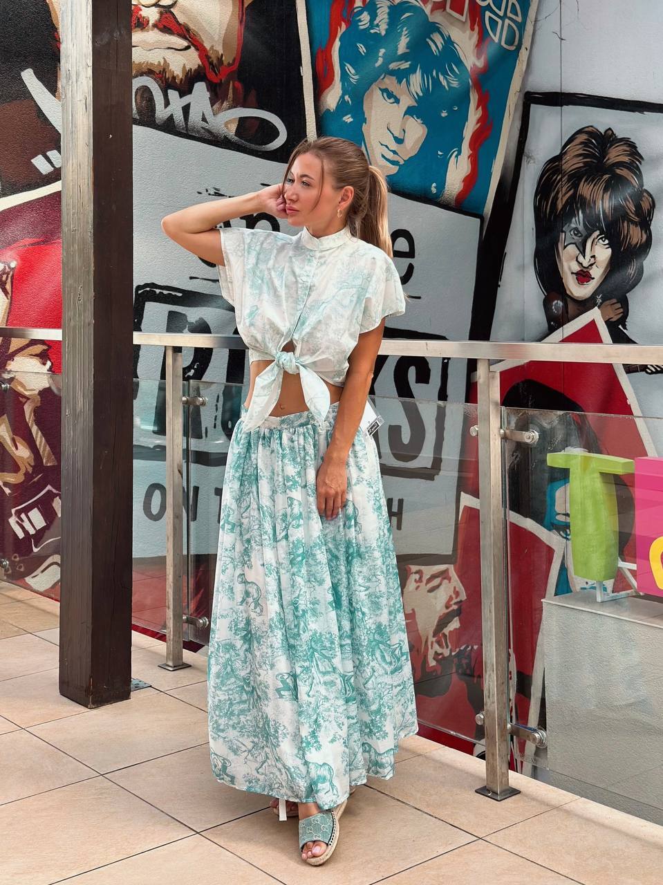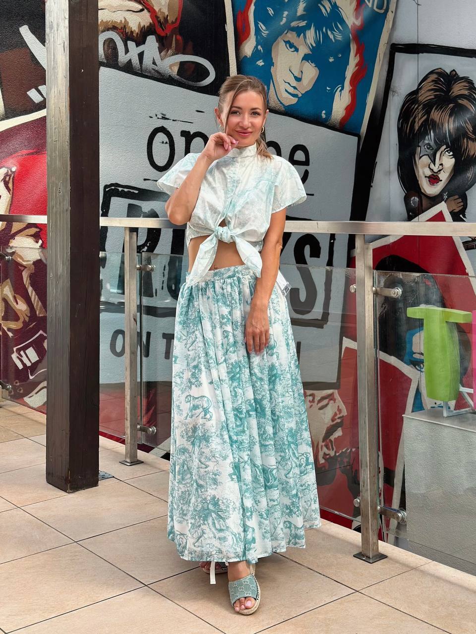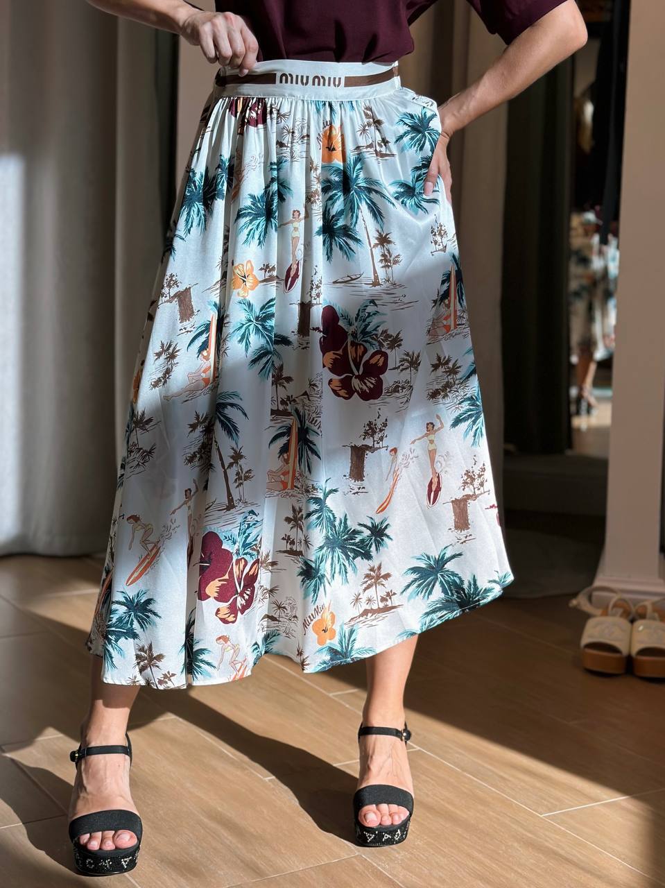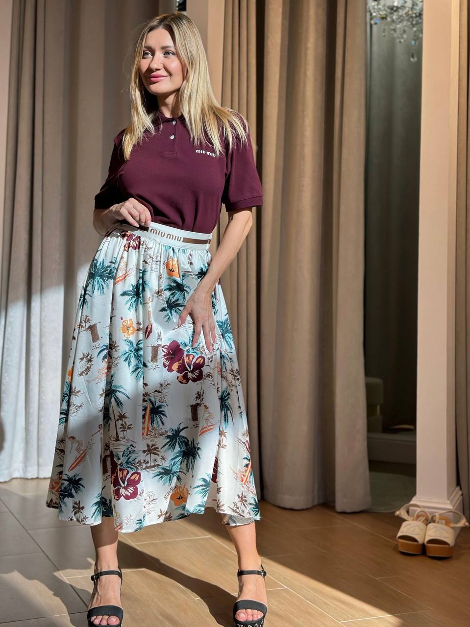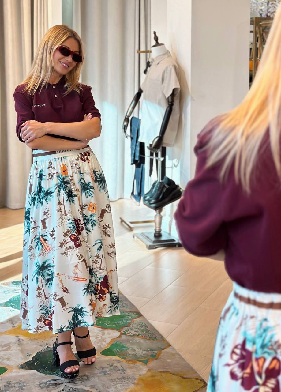 Образ из хлопковой футболки поло и струящейся юбки с принтом. Юбка из технического шелка с контрастным принтом в виде пальм. Мягкие складки и плавный силуэт подчеркивают женственность. Детали: - Легкий технический шелк с тропическим принтом - Свободный струящийся крой - Высокая линия талии - Бордовое поло для контрастного сочетания С чем носить: С босоножками на низком ходу и плетеной сумкой – для летних прогулок. С каблуками и минималистичными украшениями – для вечернего выхода. Для: курортного отдыха, городских выходов и летних мероприятий.