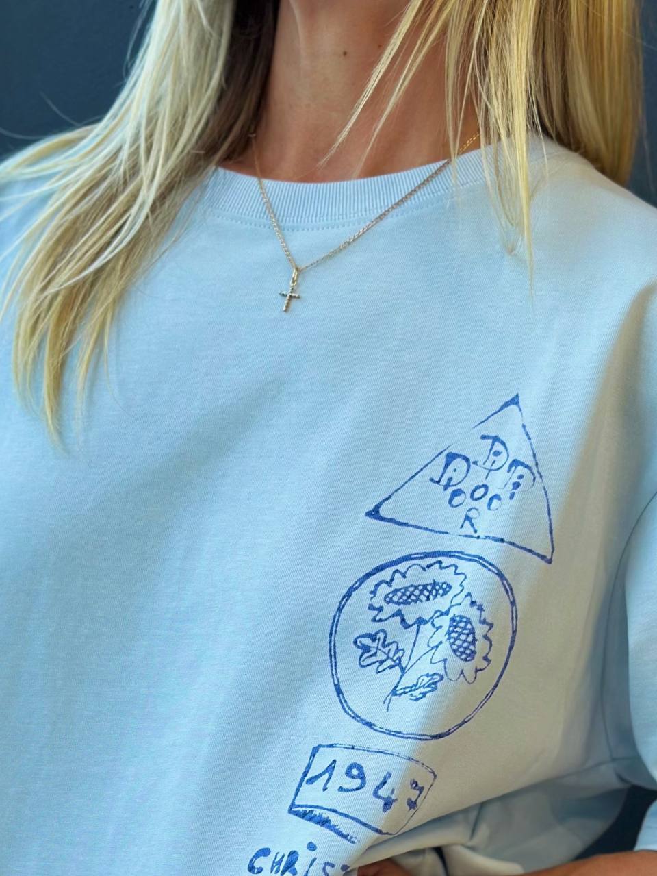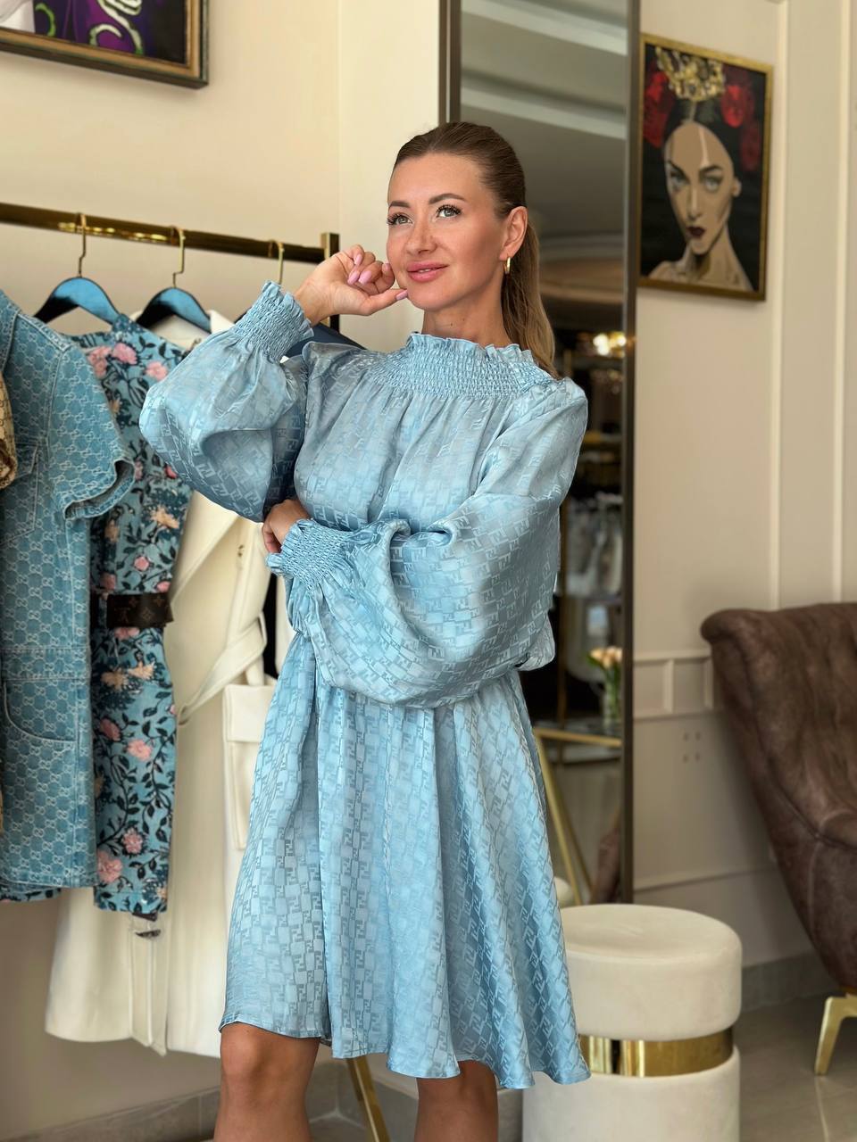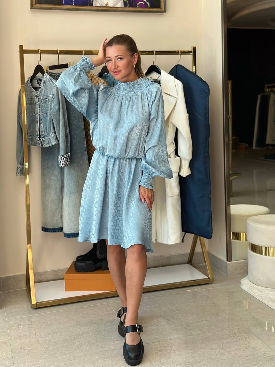 Платье небесного цвета из струящегося шелковистого материала. Модель силуэта "солнце" до колен с резинкой на талии, рукавами "фонарик" и горловиной на эластичной резинке. По всему изделию расположен переливающийся логотип бренда.
