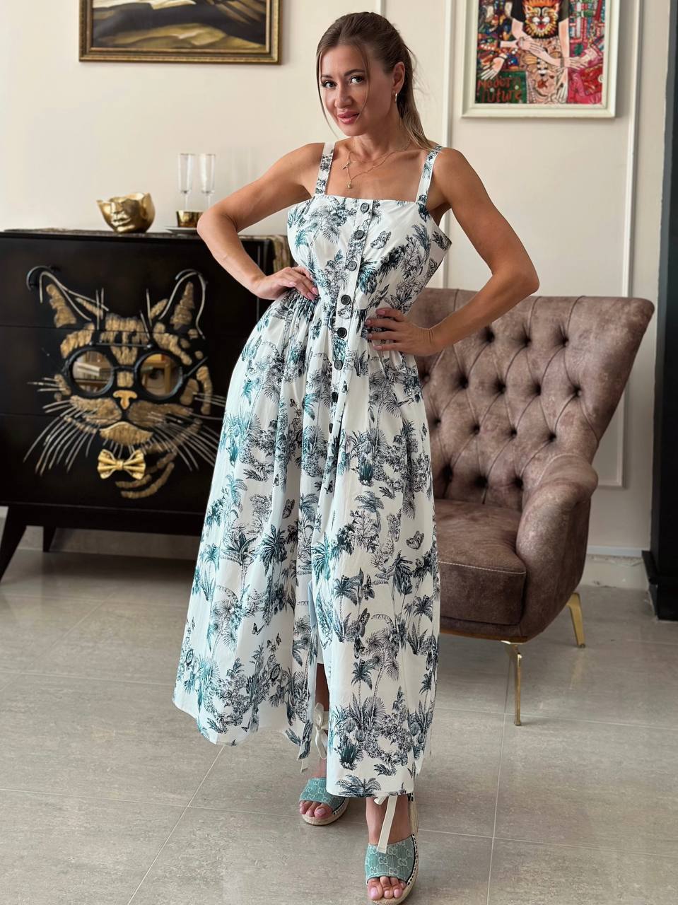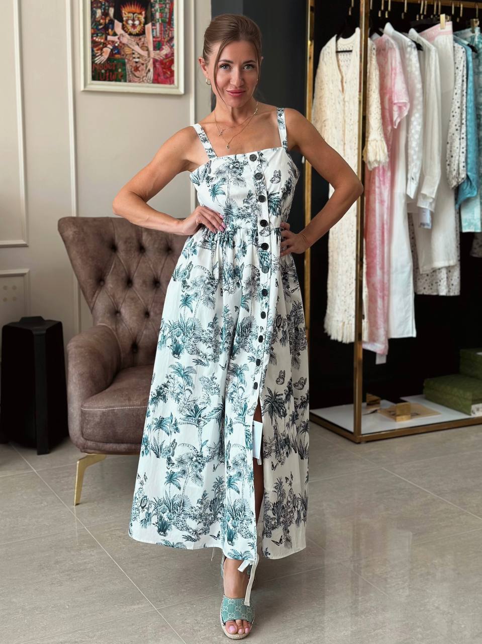 Обратите внимание на ткань — гладкий шелковистый хлопок с деликатным глянцем. Он не просто красиво струится, а буквально «охлаждает» кожу в жару.