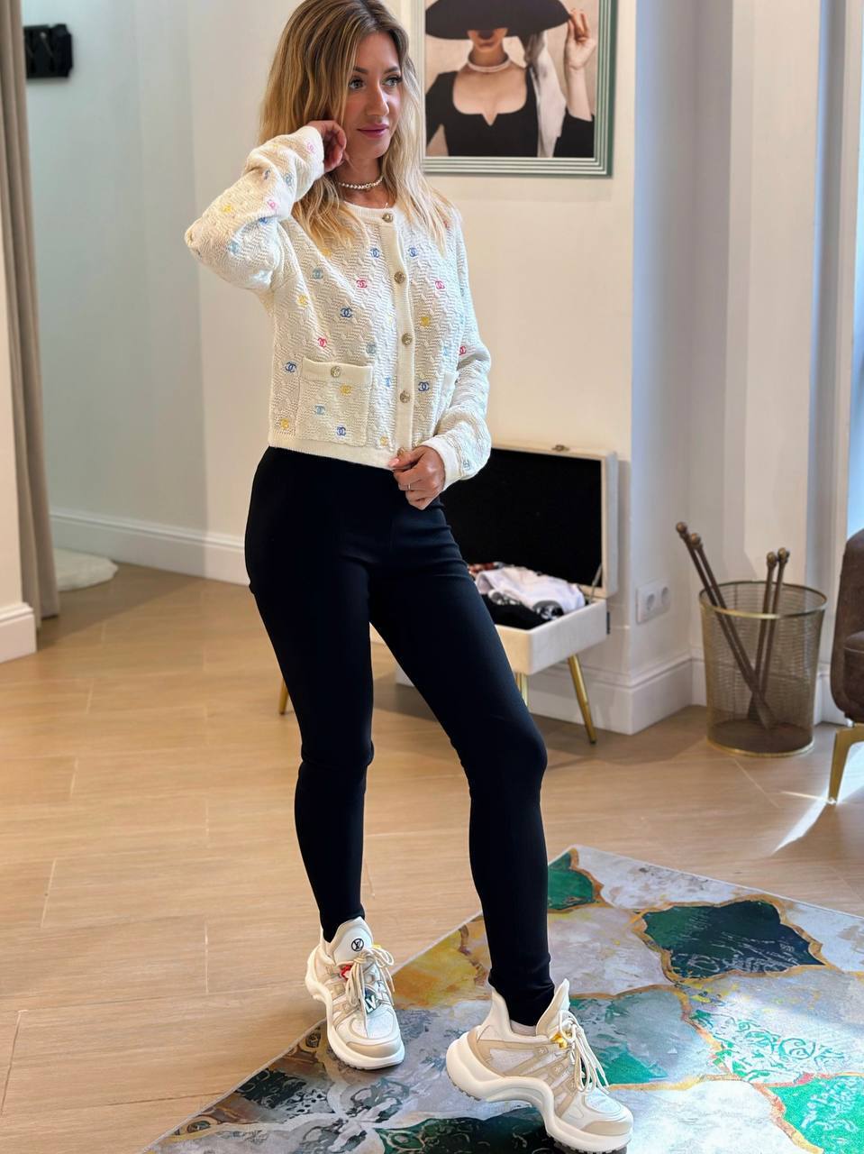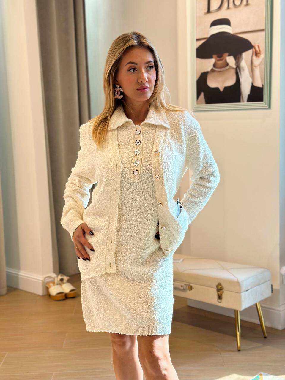 Образ с мягким хлопковым кардиганом с фирменной вышивкой. Кристальные пуговицы добавляют ноту роскоши. Как носить: - С шелковой юбкой и жемчугом — для элегантного лука - С джинсами скинни и топом — повседневный шик - С классическими брюками и блузой — офисная элегантность