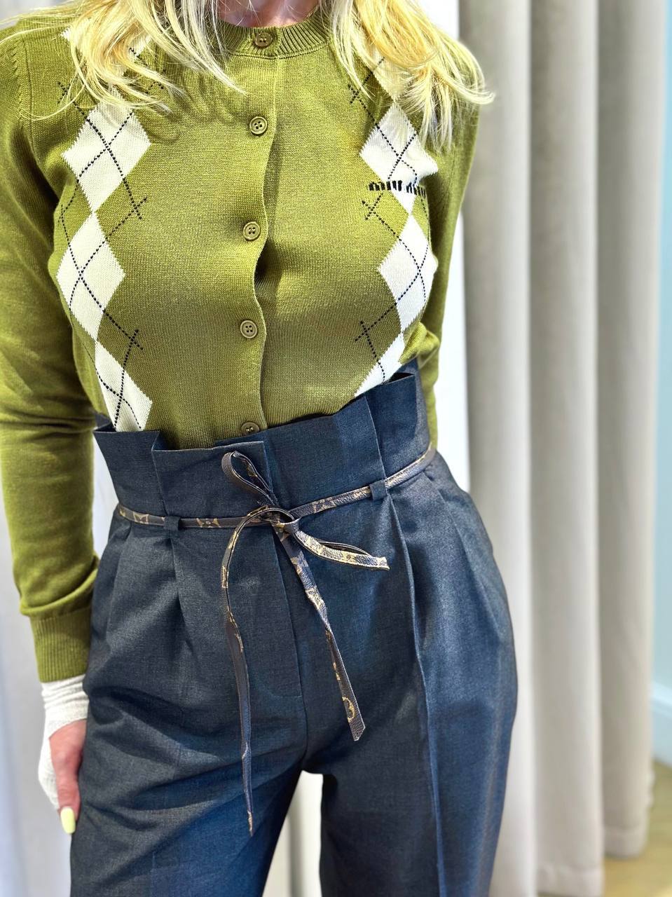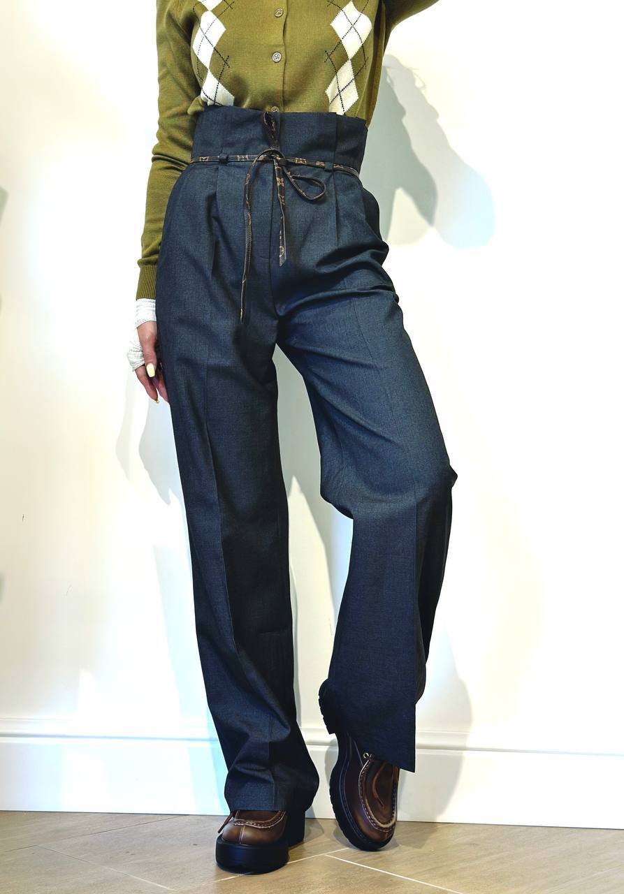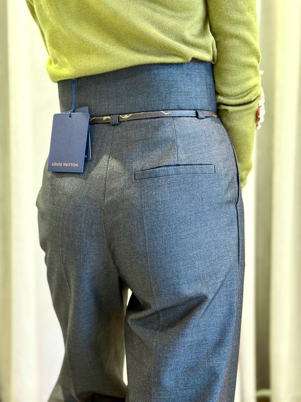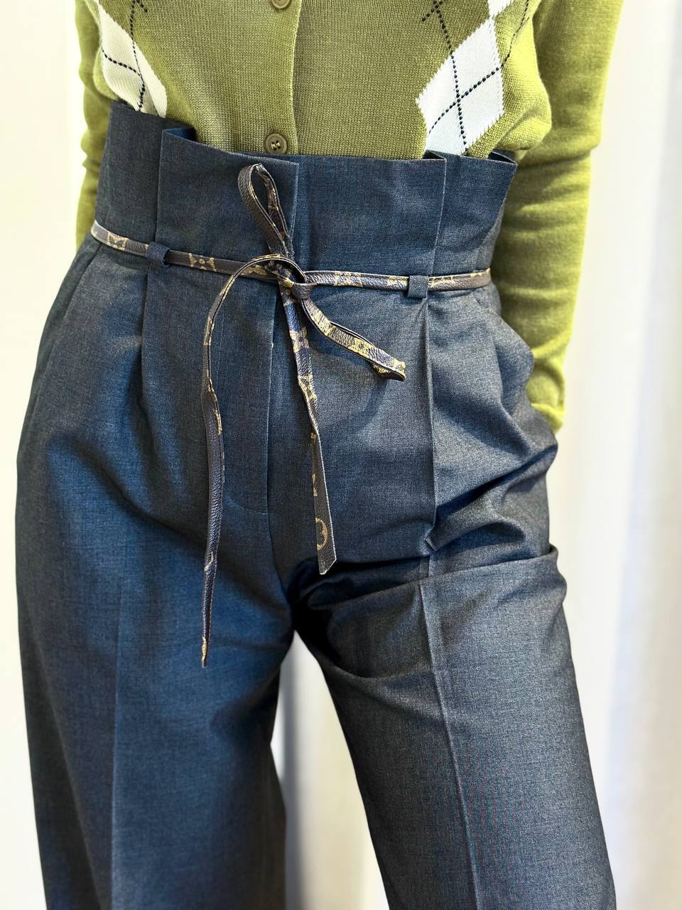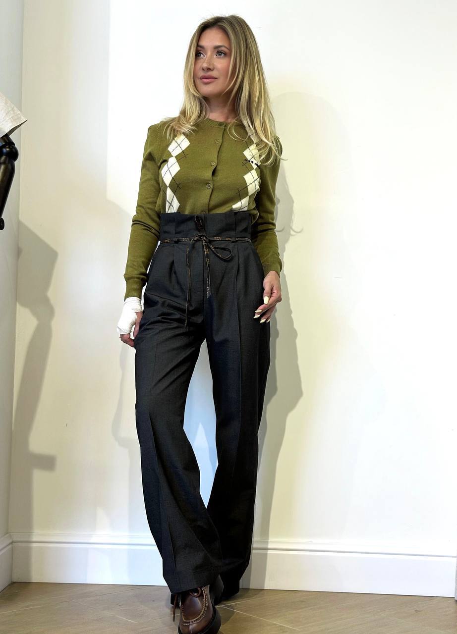 Классический образ из костюмного хлопка с современной интерпретацией. Четкие защипы и стрелки подчеркивают строгий силуэт, а высокая линия талии акцентирована тонким кожаным поясом с узором Monogram. Особенности: - Безупречный крой с защипами и стрелками - Высокая посадка для удлинения ног - Кожаный пояс с монорамным узором как стилевой акцент Комбинации: С шелковой блузой и лодочками – для делового образа. С объемным свитером и loafers – для smart casual. Для: офиса, мероприятий, городской элегантности.
