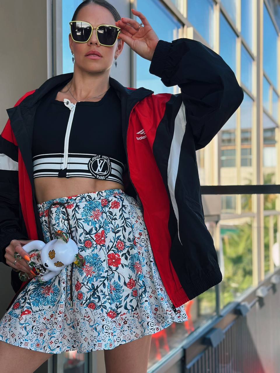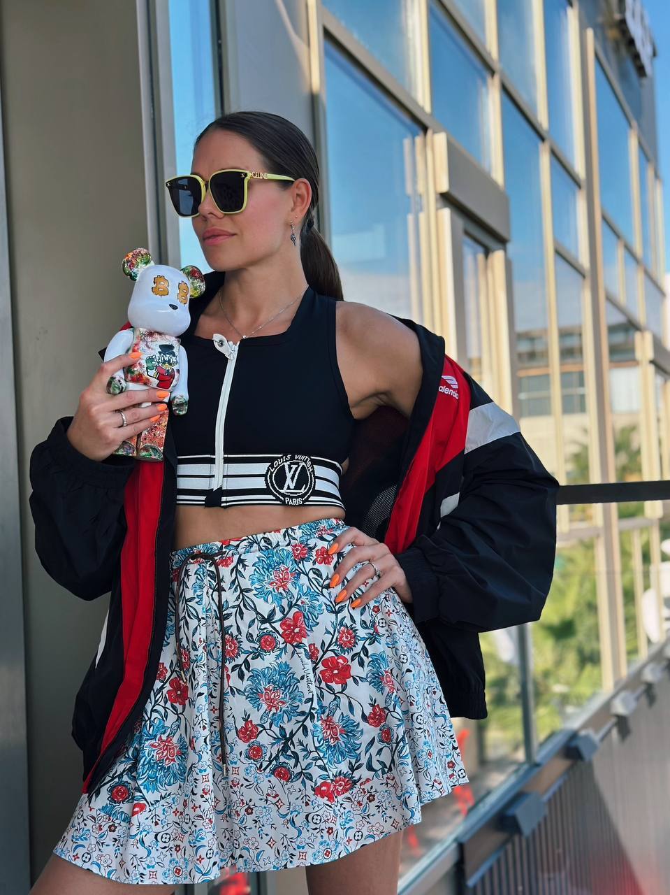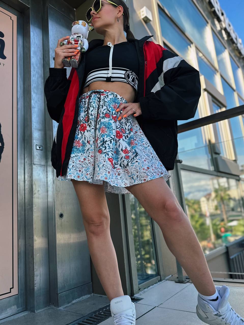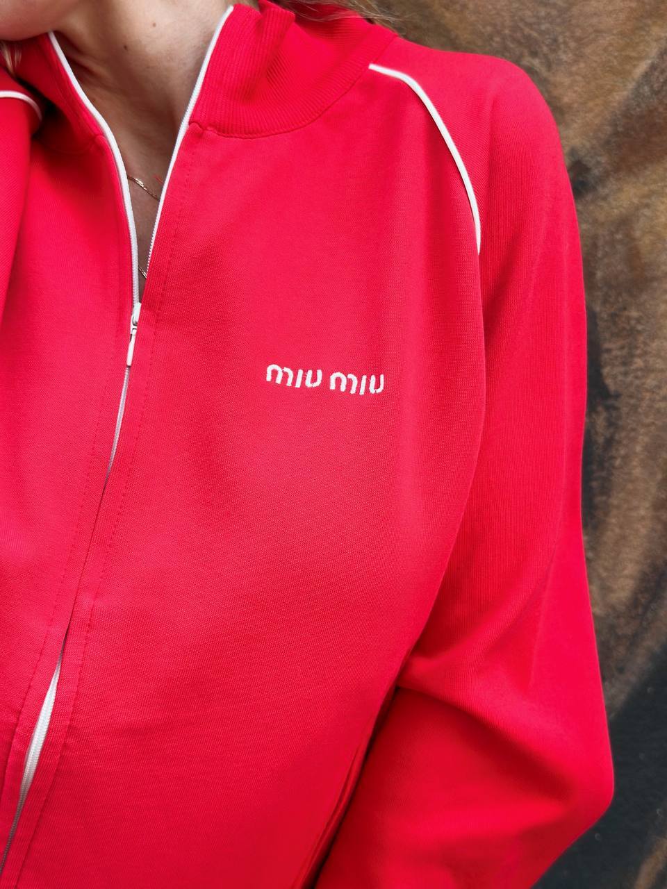 "Для вашего образа в духе Miu Miu я рекомендую этот спортивный комплект с мини-юбкой — идеальное сочетание комфорта и роскоши. Обратите внимание на фирменные детали: регулируемые завязки подчеркнут талию, а вышитый логотип добавит тот самый fashion-акцент. Рубчатая отделка и контрастные полосы создадут эффектную графику силуэта. Этот комплект невероятно универсален: сочетайте с объемными кроссовками для прогулки, с шелковой блузкой для коктейльного вечера или с кожаной косухой для дерзкого уличного образа. Премиальный хлопок обеспечит комфорт в течение всего дня, сохраняя безупречный вид. Давайте создадим ваш идеальный look вместе!"