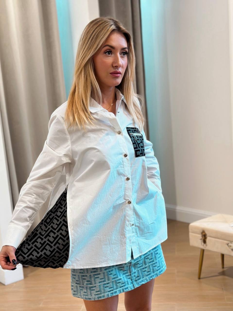 Джинсовый образ с дерзким шиком. Идеальное воплощение современной элегантности. Молочная джинсовая ткань создаёт мягкую основу, которую бренд превращает в настоящий шедевр с помощью фирменных деталей. Ключевые особенности: - Жилет с кружевной отделкой — намёк на романтичность - Юбка средней длины с металлическими элементами — дерзкий акцент - Игра контрастов: грубоватая денимовая фактура vs нежное кружево Как стилизовать: • Дневной look: с белой рубашкой и балетками • Вечерний вариант: с корсетным топом и ботфортами • Смелый образ: с кроп-топом и массивными ботинками Этот комплект — для тех, кто не боится балансировать на грани нежности и бунтарства. Valentino как всегда находит идеальную пропорцию между элегантностью и смелостью