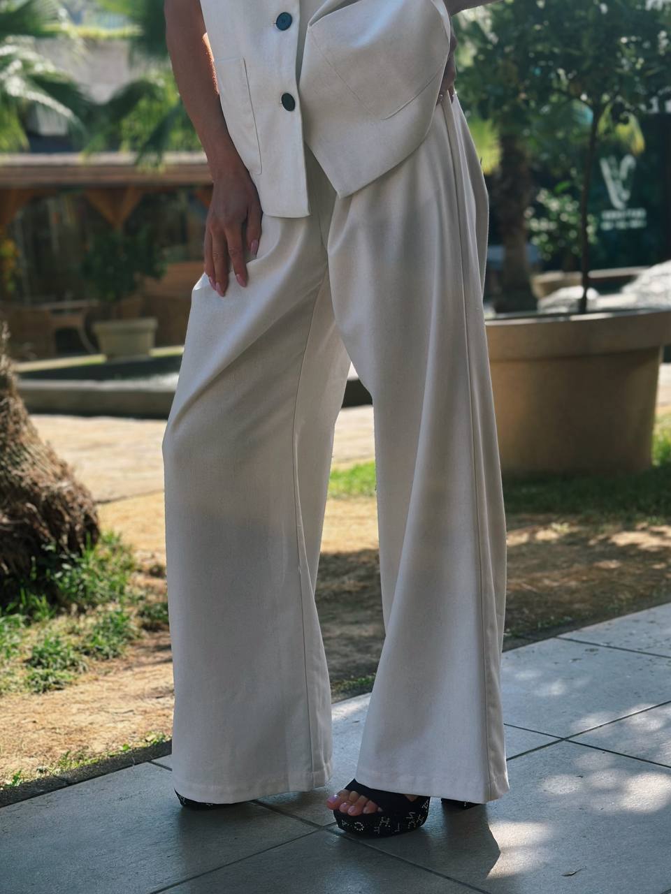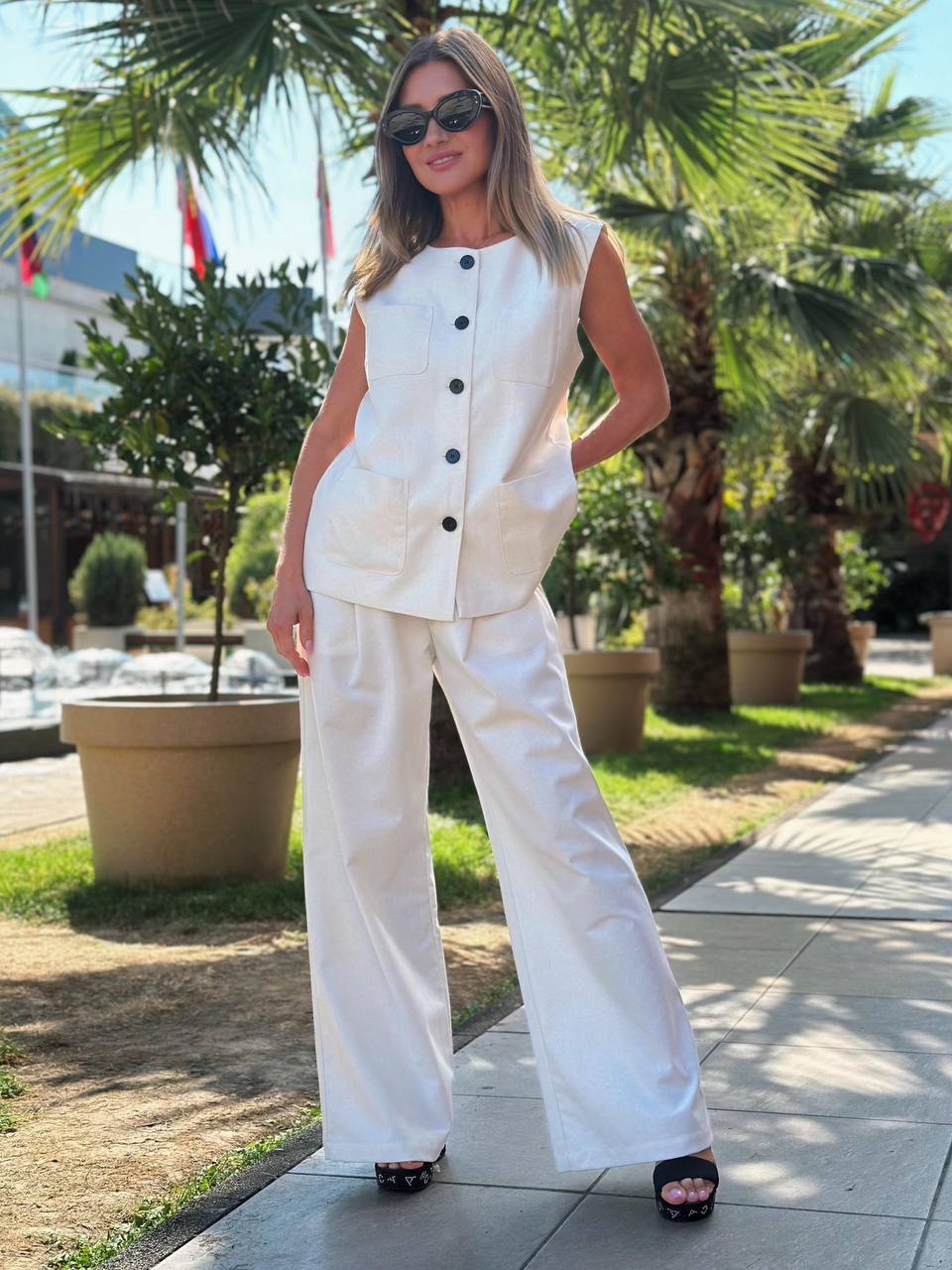 Советую носить его: • Сандалии + плетёная сумка — для курортного шика • Босоножки на каблуке + лаконичные аксессуары — smart-casual с налётом элегантности • С кедами и джинсовой курткой — для дерзкого контраста Хотите усилить эффект? Добавьте солнцезащитные очки с тонкой оправой — получится тот самый ‘quiet luxury’ look.