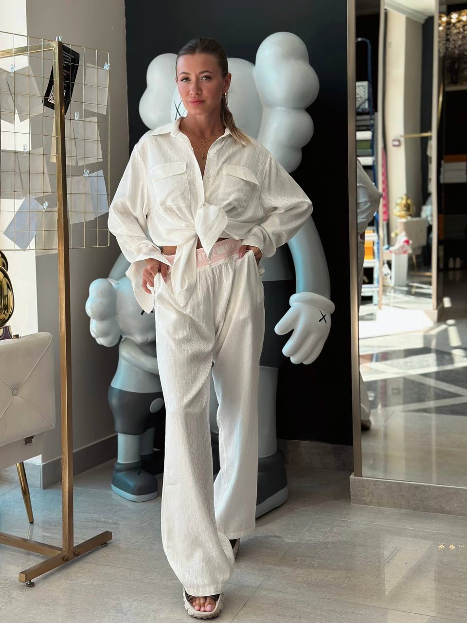 Пижамный шик с намёком на роскошь Этот комплект — идеальное воплощение тренда 'undone chic'. Мягкий хлопок пастельных оттенков создаёт ощущение уюта, а продуманный крой придаёт образу элегантную небрежность. Почему это must-have: - Расслабленный силуэт, который выглядит дорого - Универсальная палитра под любой цветотип - Тактильно приятная ткань для круглосуточного комфорта Как носить: Домашний лук: с босыми ногами и влажными волосами — искусственная небрежность На бранч: добавьте массивные золотые украшения и лоферы Вечерний вариант: набросьте кашемировое пальто, возьмите клатч