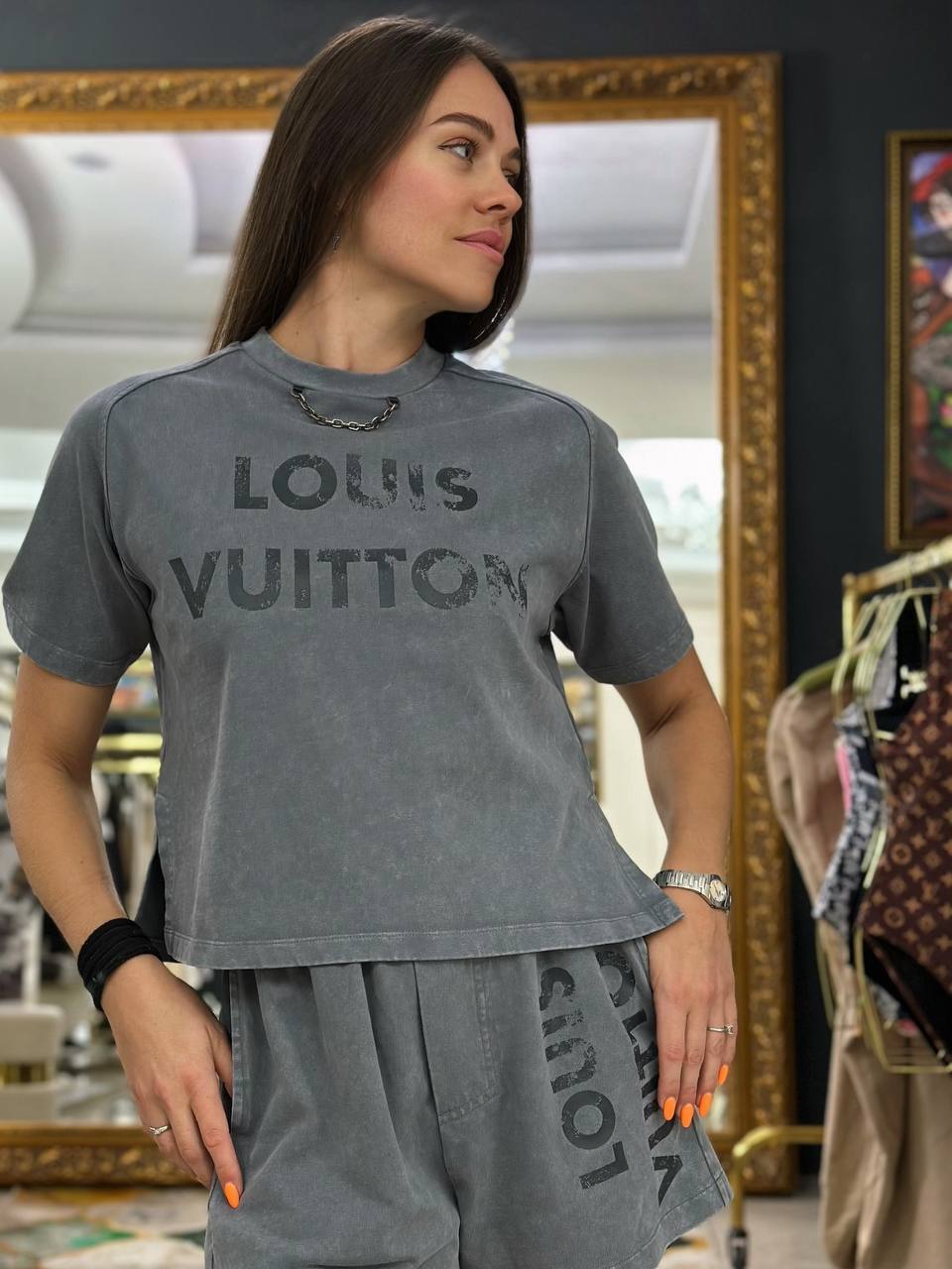 Комплект из шорт и футболки из 100% хлопка. Комплект выполнен в сером цвете-хамелеоне, который легко сочетается с другой одеждой. Футболка украшена логотипом на груди и элегантной цепочкой на горловине.