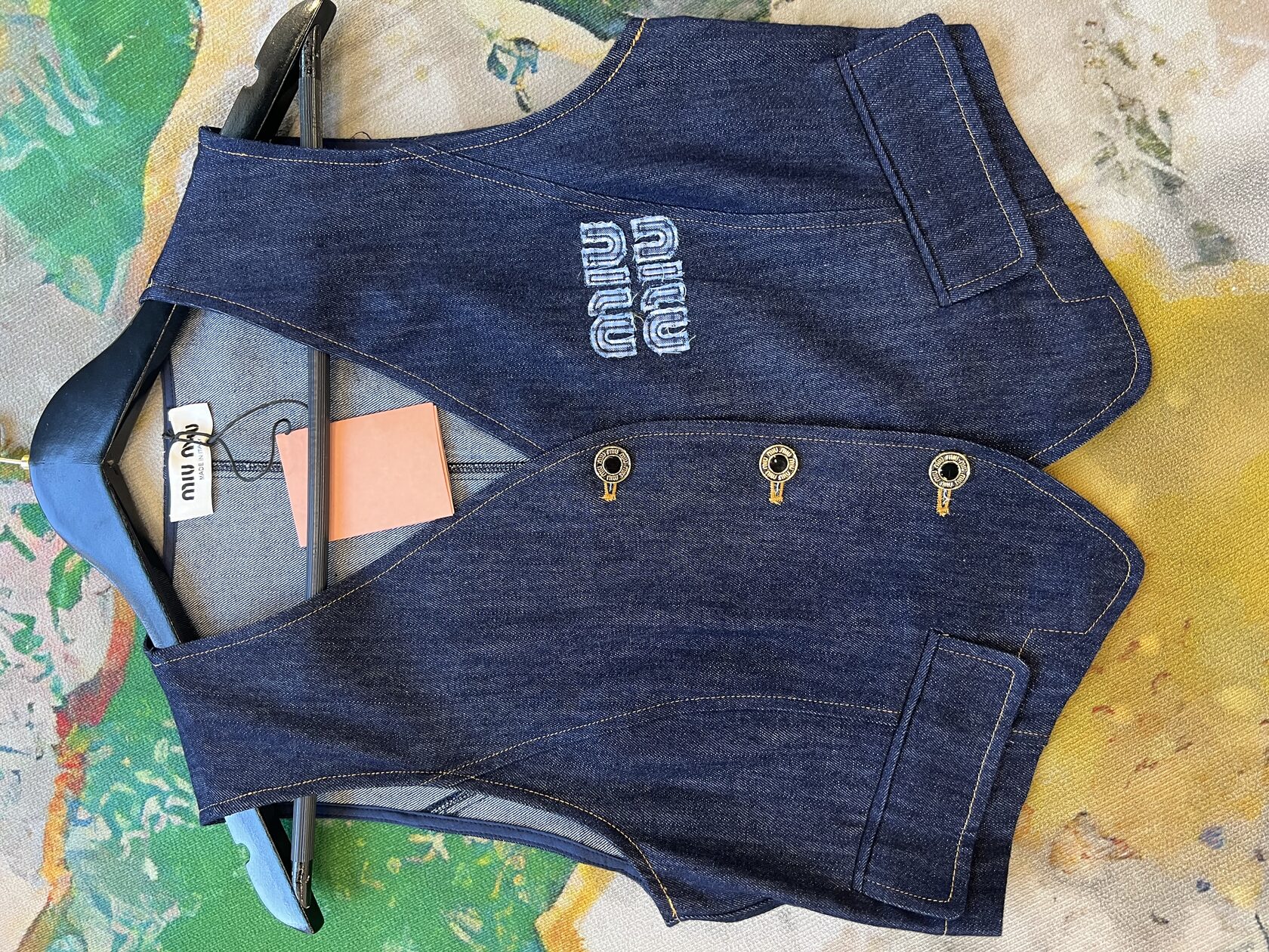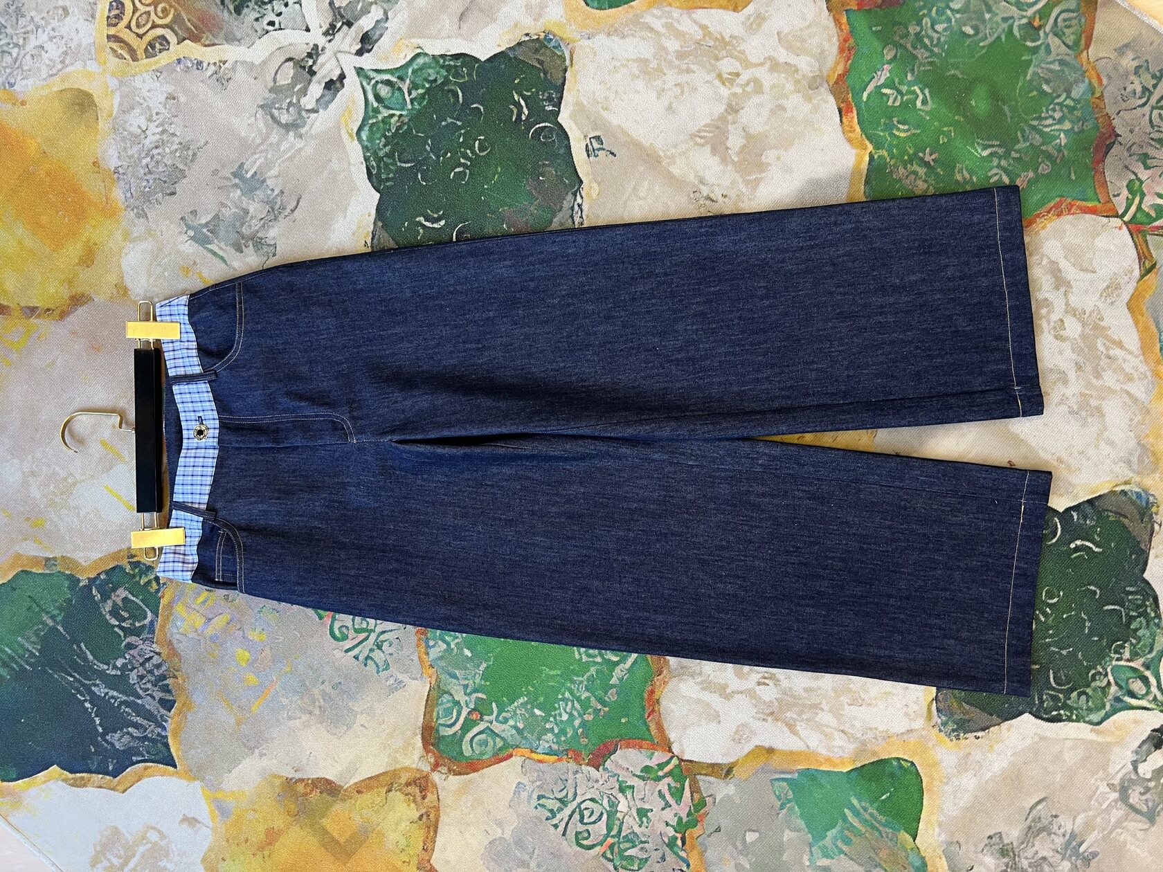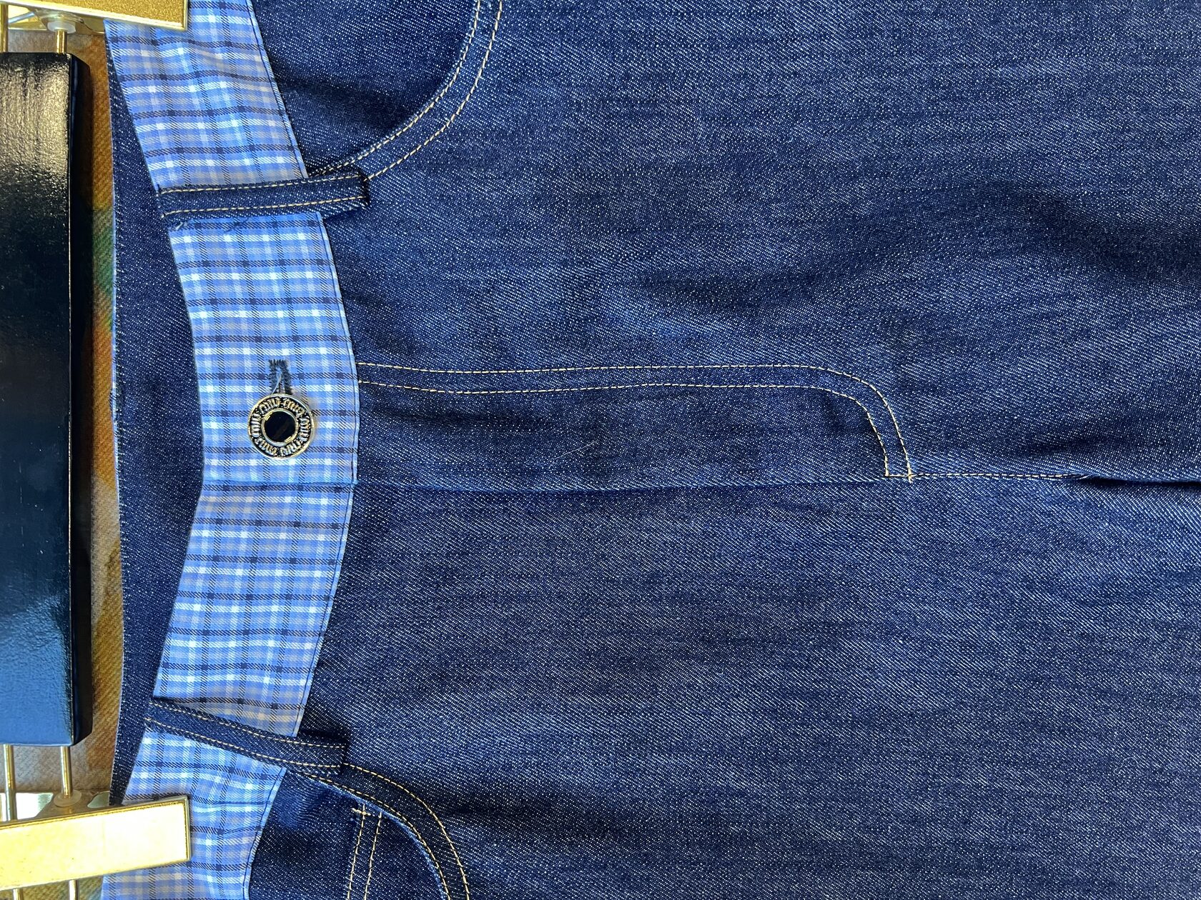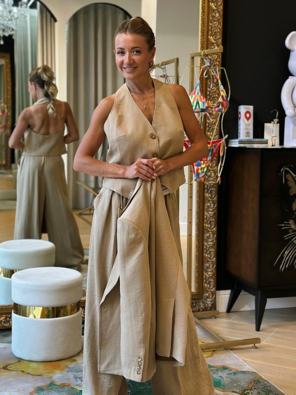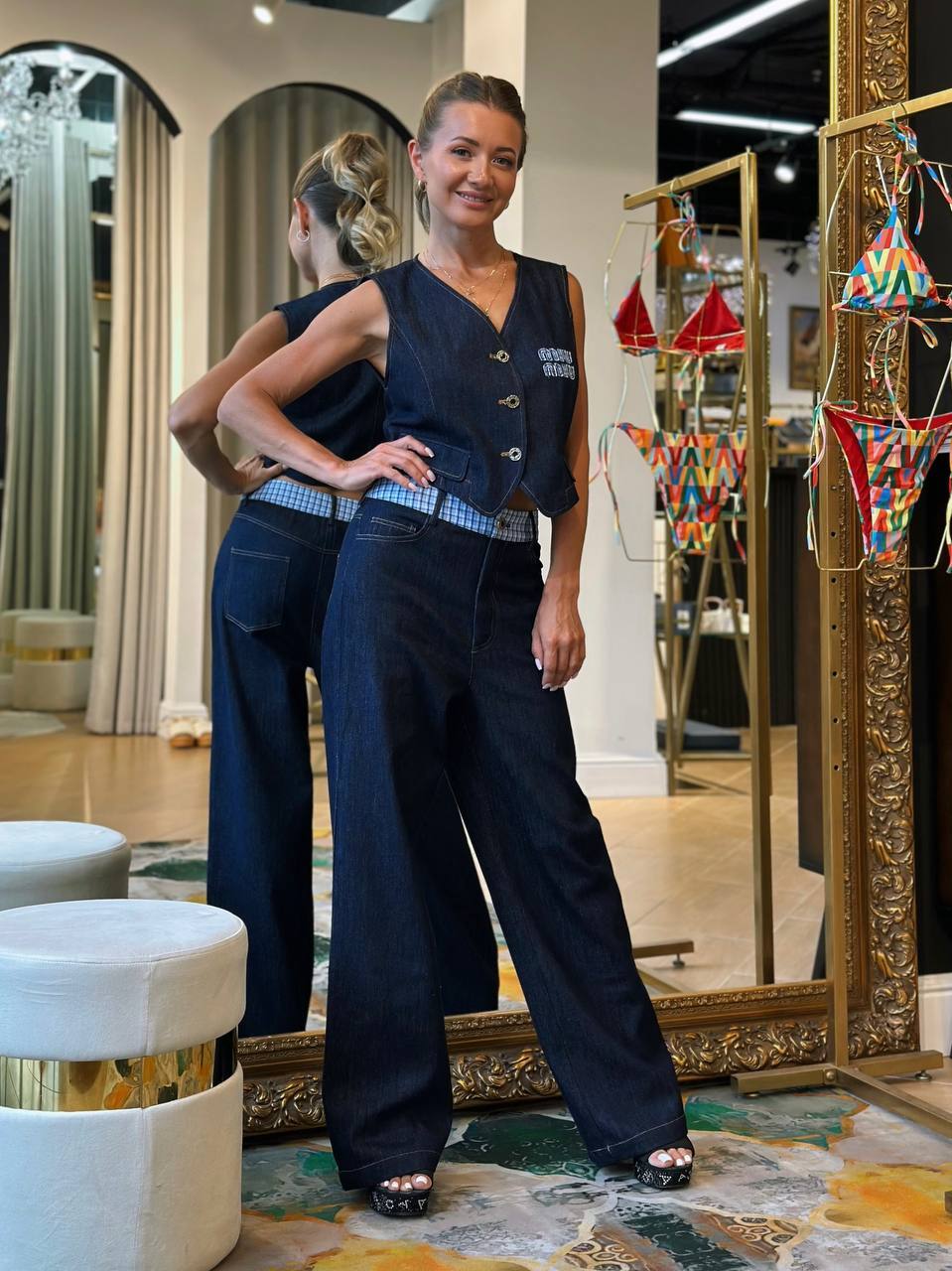 Хлопковый комплект, стилизованный под джинсу. Мягкий, премиальный, с саржевым плетением. Жилет — V-образный вырез, укороченный крой, карманы и пуговицы для акцента на талии. Брюки — высокая талия, прямой крой, декоративная клетчатая вставка на поясе. С чем носить: Жилет — с шелковым топом и юбкой-миди для коктейльного образа. Брюки — с объемным свитером или приталенной рубашкой для smart casual. Комплект — с каблуками и минималистичными аксессуарами для вечернего выхода. Куда надеть: Ужин в ресторане Вернисаж Шопинг в городе Свидание Путешествие