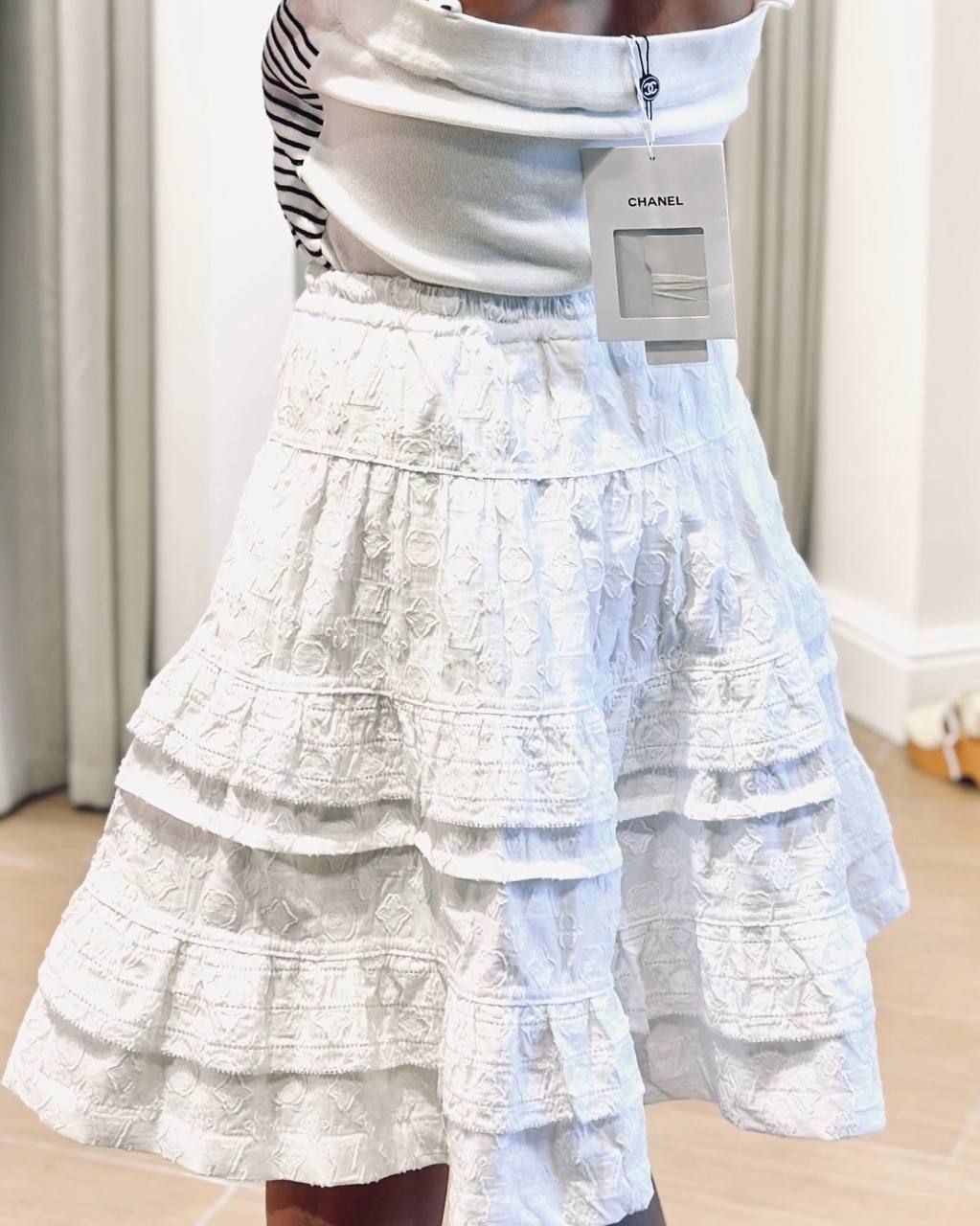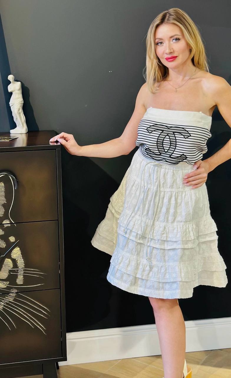 Воздушная белая юбка из натурального хлопка с фирменным узорам Monogram. Пышный крой, игривые воланы и длина до колена создают элегантный и лёгкий образ. Сочетайте с лаконичными блузами, каблуками или кедами для завершенного лука.