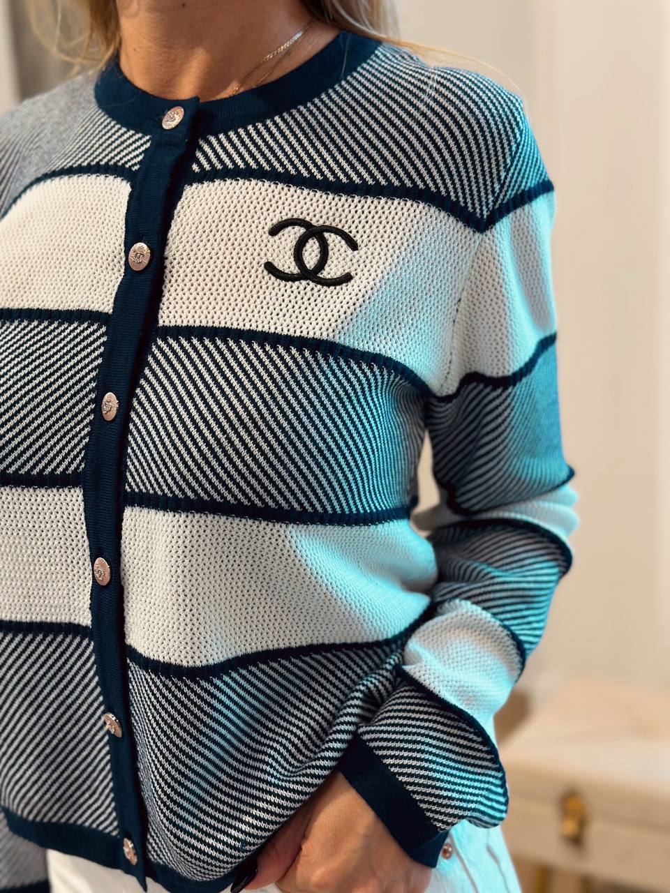 Французская классика с комфортом Мягкая шерсть — уют, тепло, нежность к коже. Детали: фирменные фигурные пуговицы, свободный крой, морская полоска. Фишка: широкая сине-белая полоска — намёк на вечную элегантность Chanel. С чем носить: С белыми брюками и лодочками — парижский шик. С джинсами-скинни и матросской тельняшкой — casual с налётом роскоши. С юбкой-карандаш и жемчугом — офисный шик. Куда: прогулки по набережной, ланч в кафе, деловые встречи, путешествия.