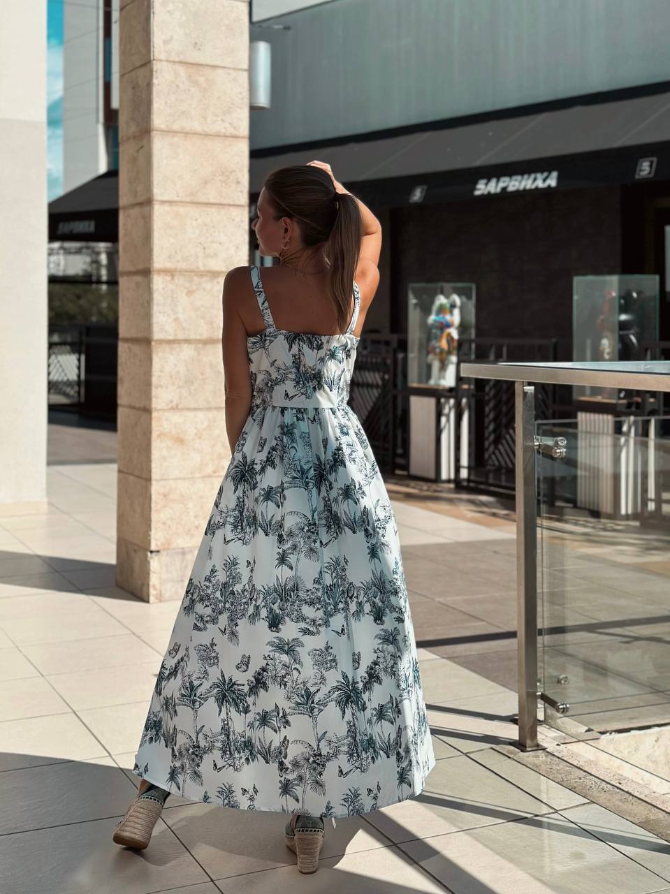Для: летних мероприятий, отпуска, прогулок по городу. Сарафан сочетает элегантный крой с тропическим настроением.