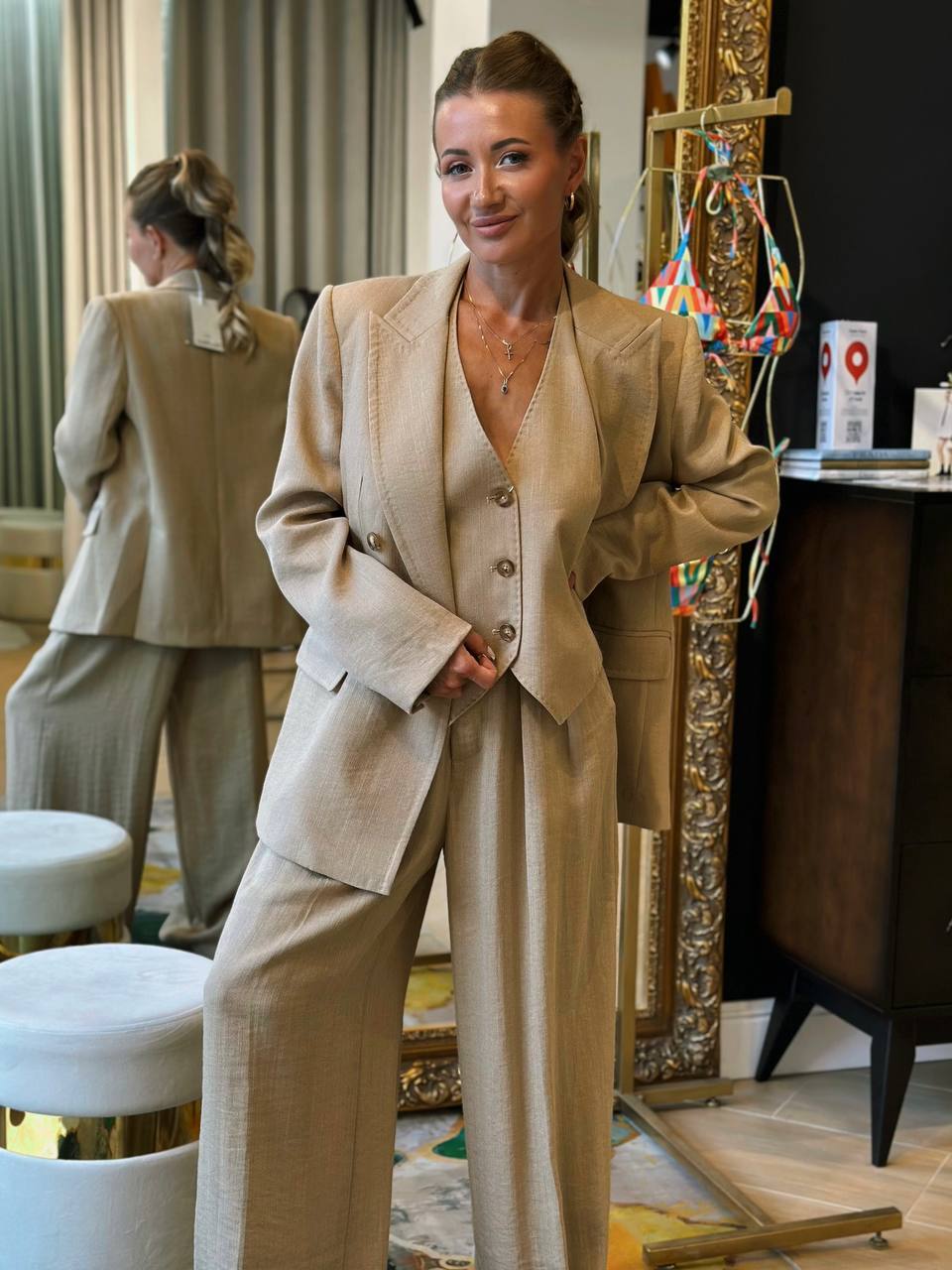 Элегантный образ тройка из импортной YV ткани премиального качества. Бежевый оттенок подчеркивает утонченность и универсальность модели. Особенности: - Полный комплект: пиджак, жилет и брюки - Идеальная посадка по фигуре - Универсальный бежевый цвет - Возможность комбинировать элементы вместе и по отдельности С чем носить: - Полный комплект: с классической рубашкой и лоферами – для деловых встреч - Пиджак + брюки: с топом и туфлями на каблуке – для вечернего выхода - Жилет + брюки: с футболкой и кедами – для casual-образа - Пиджак отдельно: с джинсами и водолазкой – для smart casual Для: офиса, мероприятий, повседневной носки.
