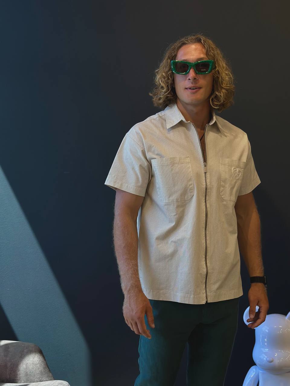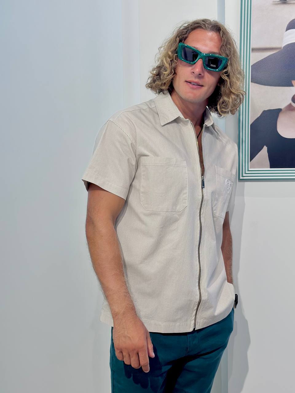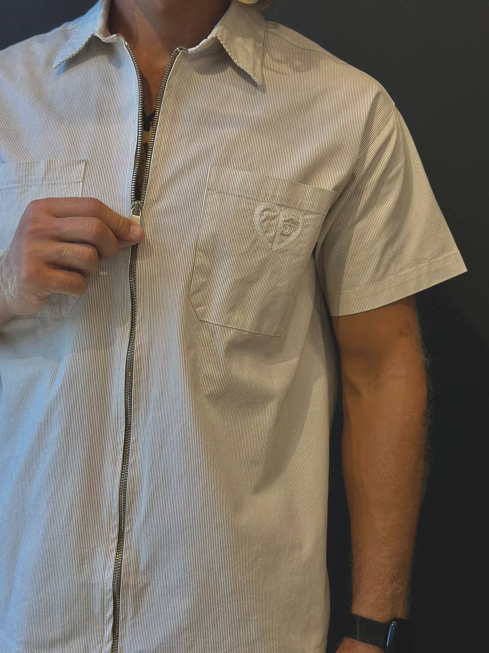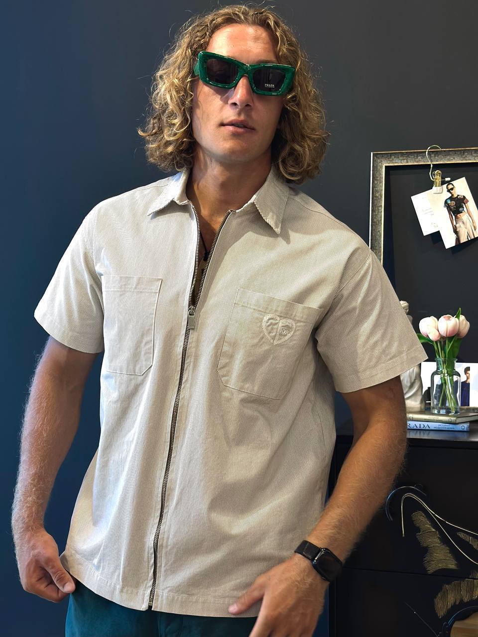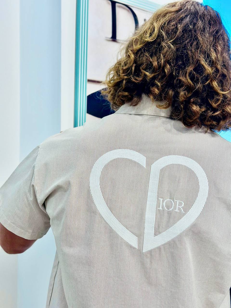 Уютный образ в стиле Dior с бежевой хлопковой рубашкой, с коротким рукавом; стильная, удобная и универсальная. Материал: 100% хлопок (приятный к телу, дышащий). Цвет: классический бежевый с полоской. Фасон: - Короткий рукав - Застёжка на молнию - Два нагрудных кармана Дизайн - эксклюзивная вышивка на спине в виде сердца Dior шелковой нитью (смотрится роскошно!)