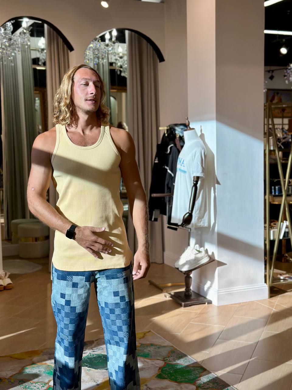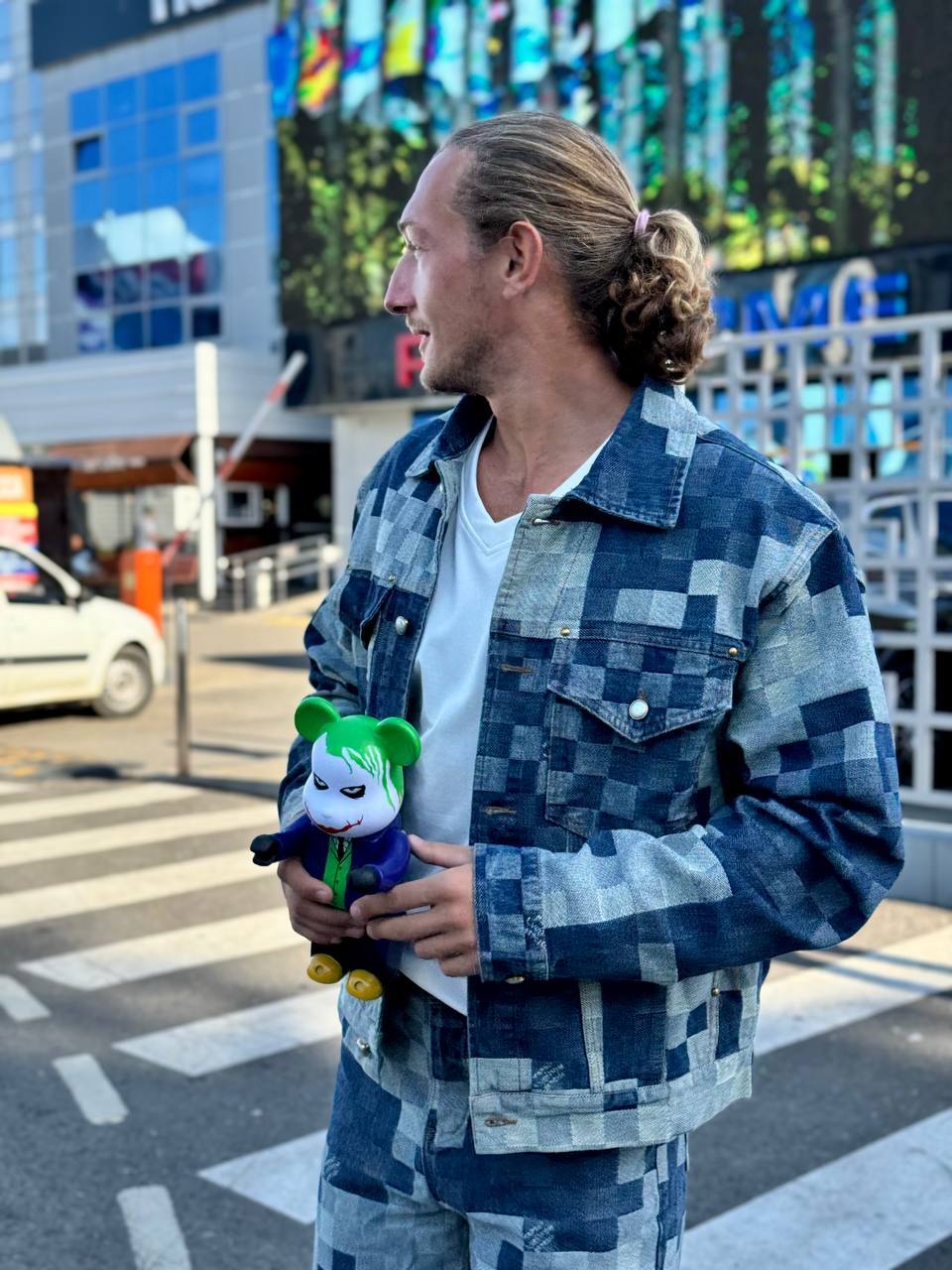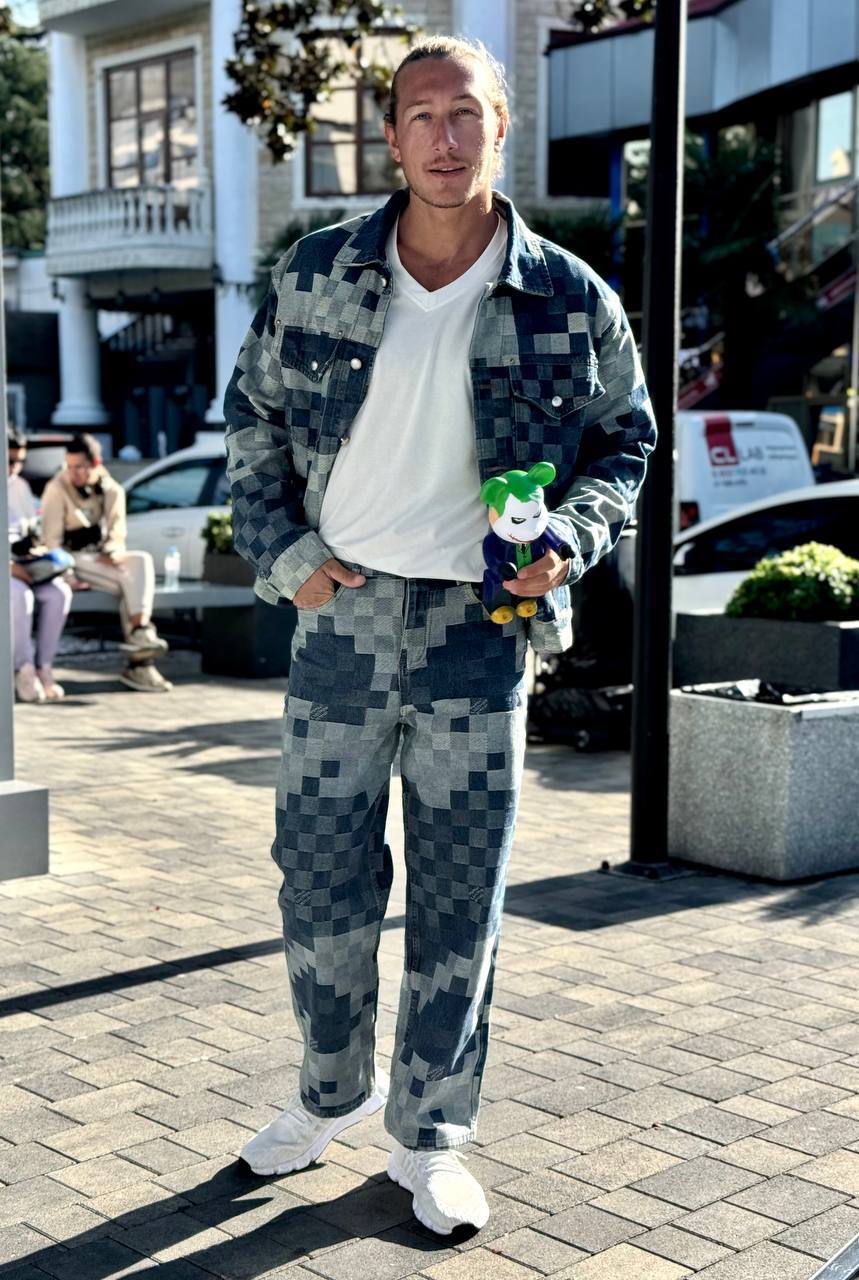 Джинсовый образ с принтом Damoflage 3 образа: 1. Уличный шик – с кроссовками и цепями 2. Смарт-кэжуал – с водолазкой и челси 3. Вечерний лук – с шёлковыми шортами и ботфортами Фишка: градиентный жаккард + винтажные пуговицы. Носите вместе или раздельно – с юбками, свитерами или топами.